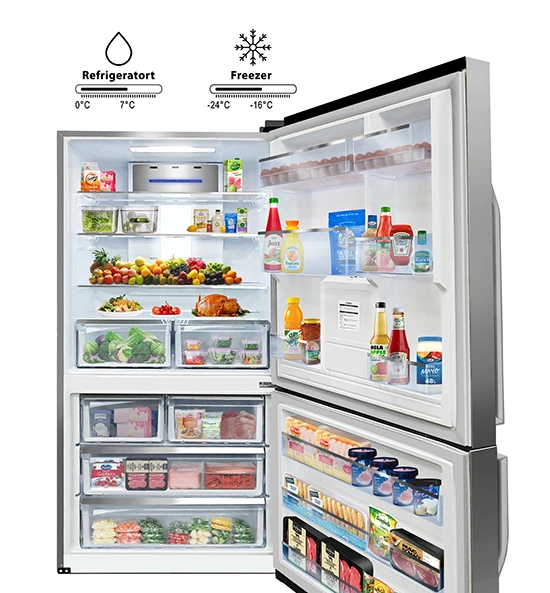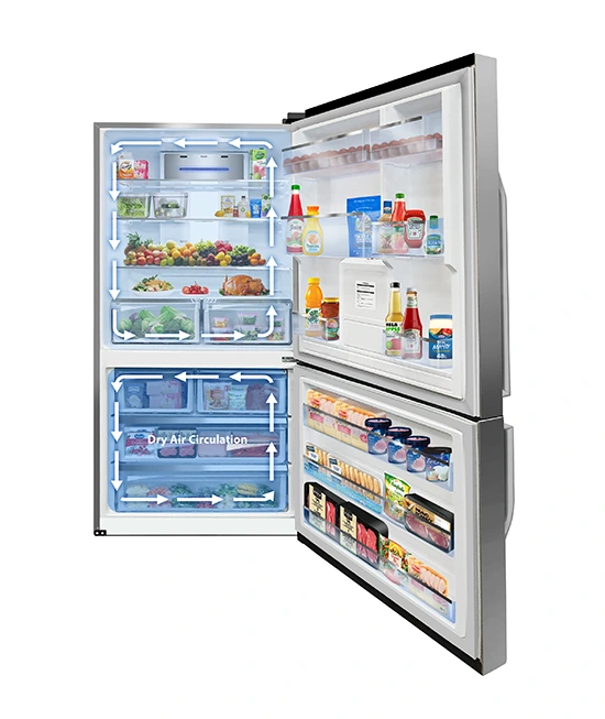 The No Frost technology with a dry air circulation system eliminates moisture from compartments and prevents the frost accumulation on food.