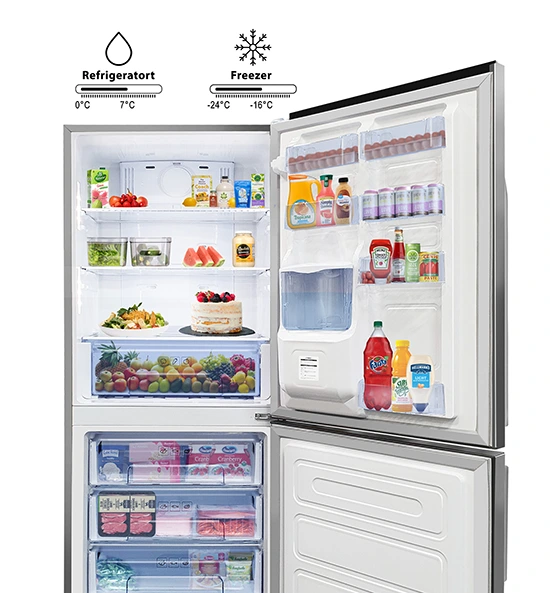 The No Frost technology with a dry air circulation system eliminates moisture from compartments and prevents the frost accumulation on food.