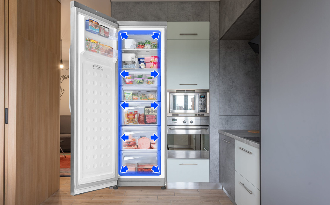 This cooling system enables quicker arrival at optimum temperature and uses less energy. Your food stays fresher with the all-around cooling system, which cools the freezer from corner to corner.