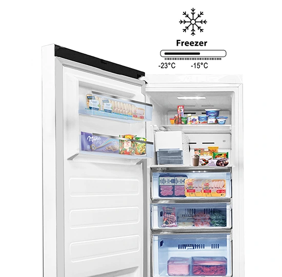 The No Frost technology with a dry air circulation system eliminates moisture from compartments and prevents the frost accumulation on food.