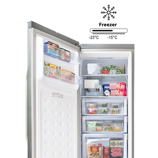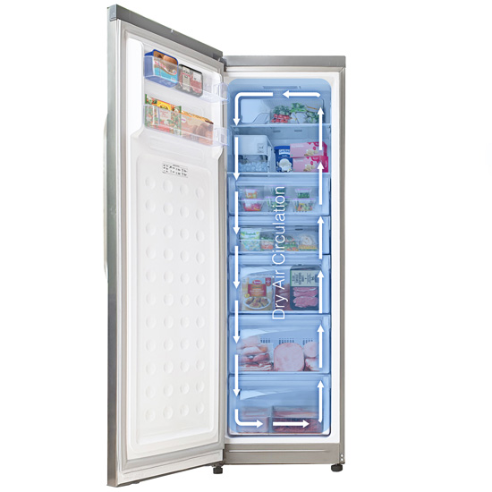The No Frost technology with a dry air circulation system eliminates moisture from compartments and prevents the frost accumulation on food.