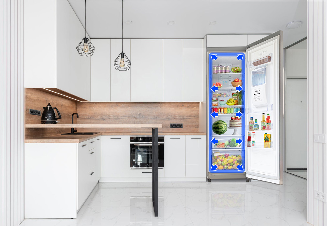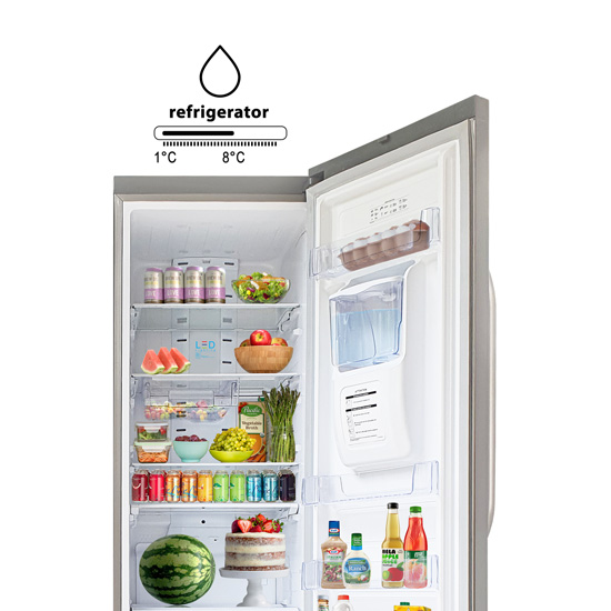 With the Super Cool function, the refrigerator reaches optimum temperature faster and uses less energy. The Power Cool function keeps the food fresh for a long time and quickly cools your groceries.